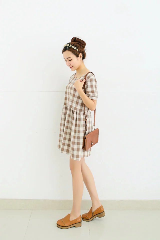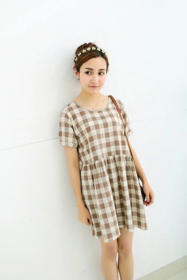 S9796 2017夏季女裝新款百搭格子短袖中長裙女學生韓版寬松連衣裙